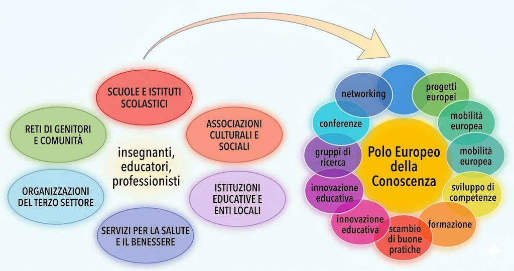 La rete è aperta all’adesione di qualsiasi Istituzione pubblica o privata, Università, Associazioni, Enti, Cooperative che abbia fra i propri scopi principali e/o secondari l’educazione formale, informale diretta o indiretta, e la promozione dei valori dell’Unione Europea come l’hanno voluta i padri fondatori. L’adesione alla rete è gratuita e non comporta alcun vincolo.