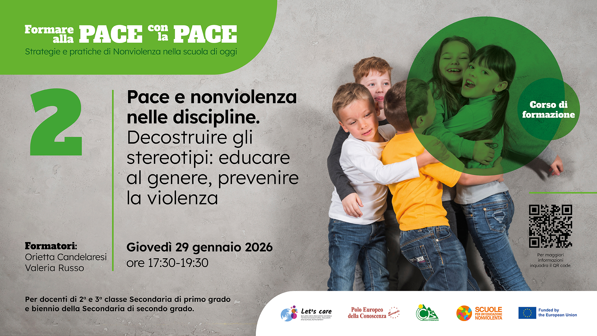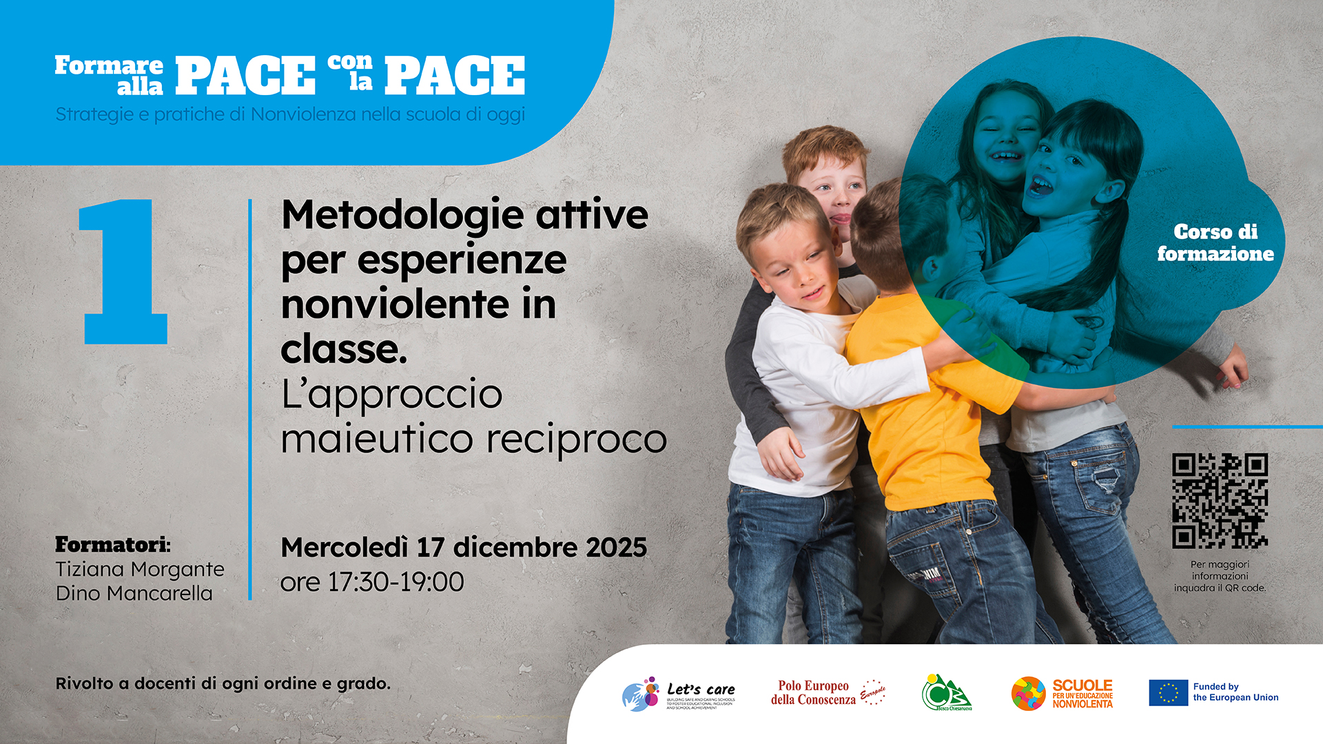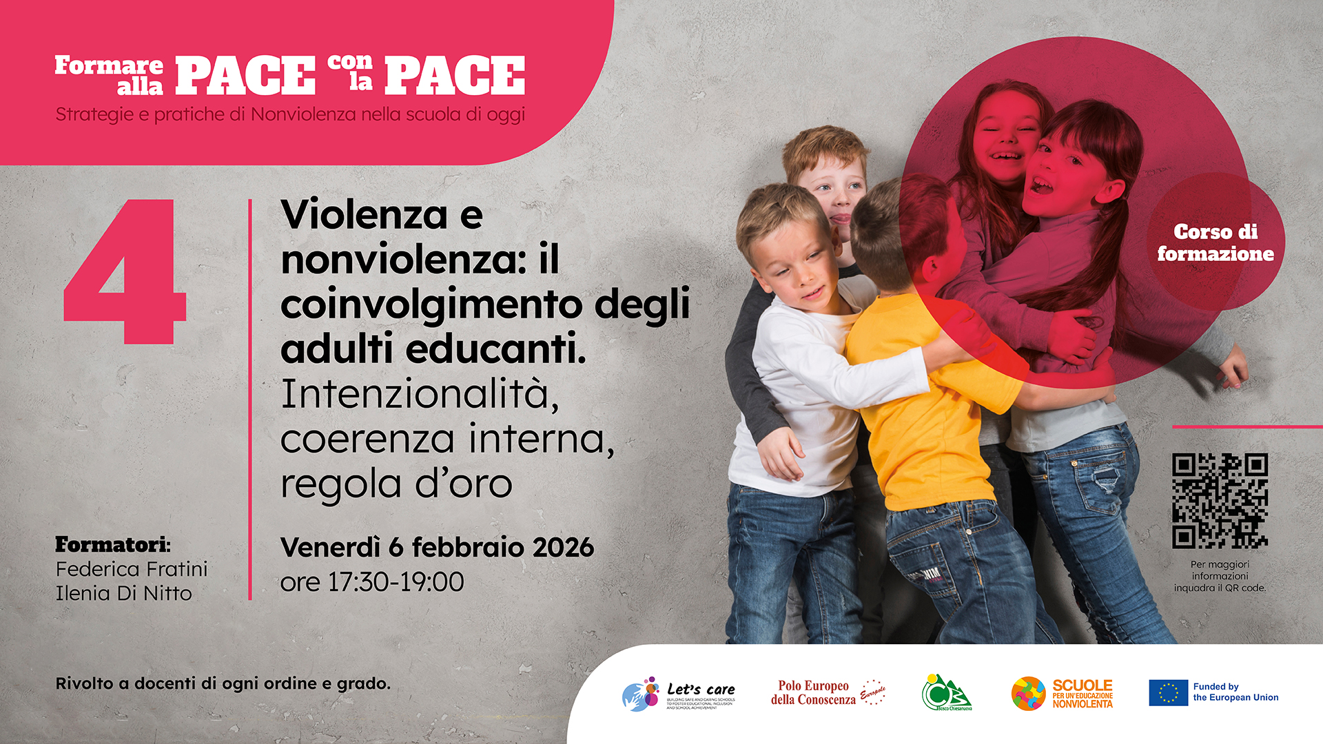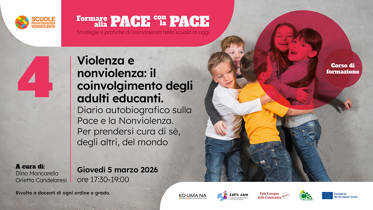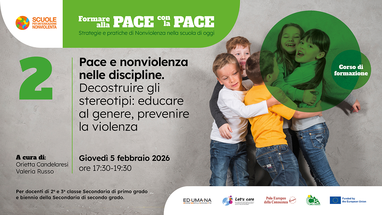 Percorso di formazione gratuito ONLINE rivolto a docenti di ogni ordine e grado, finalizzato a promuovere pratiche educative ispirate ai principi della pace e della nonviolenza, del dialogo e della trasformazione costruttiva dei conflitti.